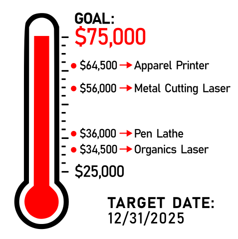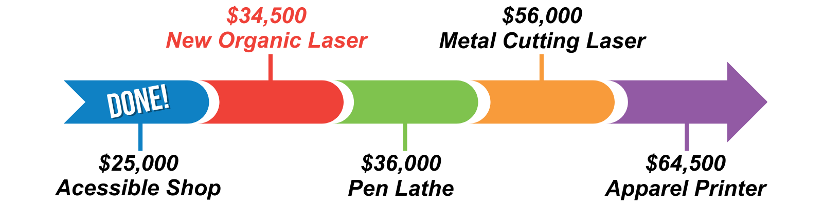 Beyond $25,000 helps fund new tools. At $64,500, all four new tools will be funded! Additional funding after that supports accessibility improvements in the shop, entrepreneurship and artist in residence programming, and much more!