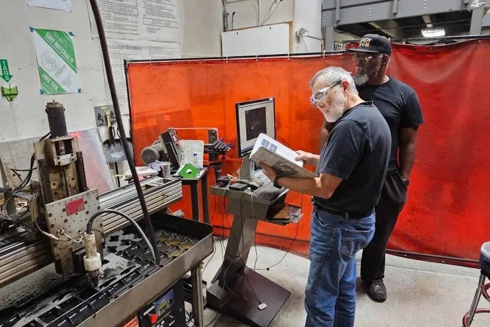 Randy reviewing the process of Plasma Cutting with John, a member working on a project for their motorcycle.