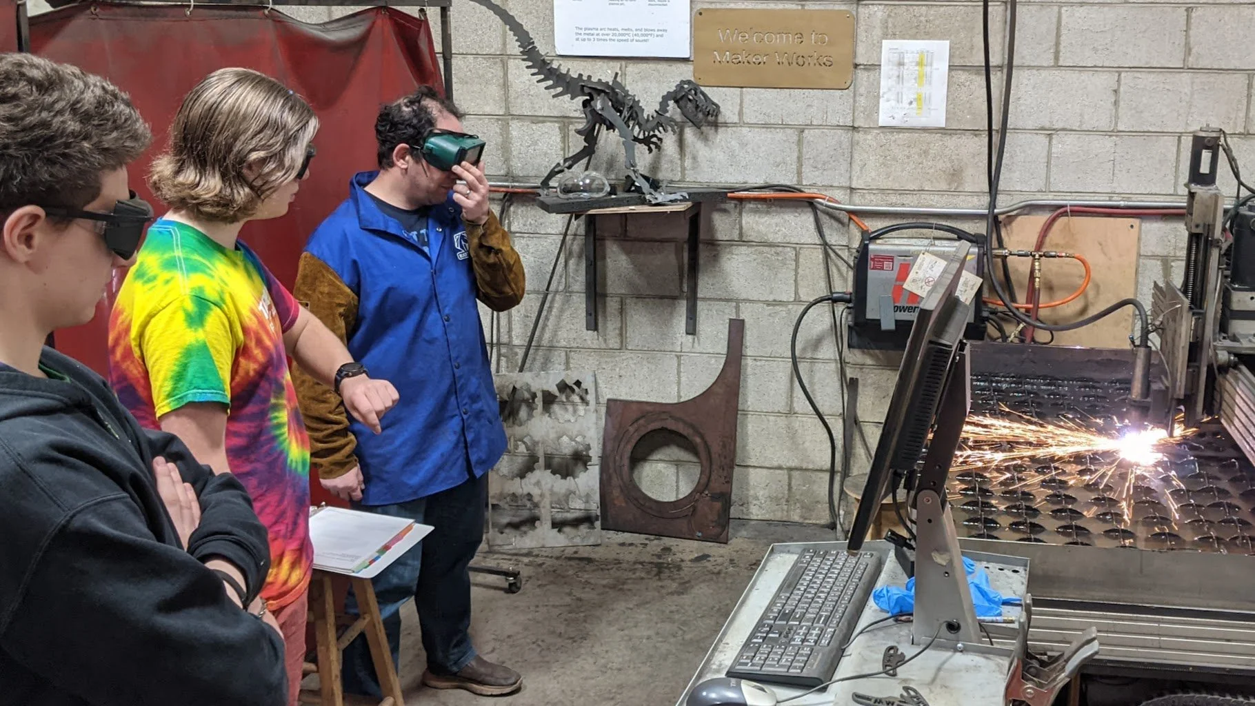 Epic volunteer Mark teaching FIRST High School Robotics Students how to safely operate the CNC Plasma Cutter