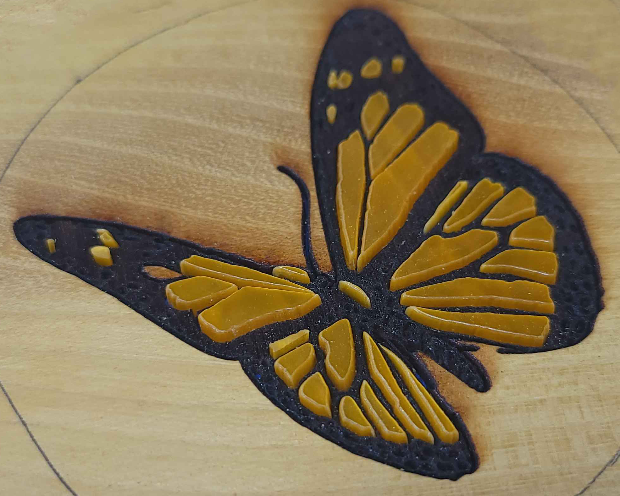 Nearly everyday he came in and used Inkscape to try new things, finding new questions along the way. How do nodes work? What does the pen tool do? Whenever he encountered an obstacle, Maker Works staff nudged him in the right direction. In two weeks, he was able to use the software to translate images of things like butterflies and dragons into perfect-fitting inlays for his projects.