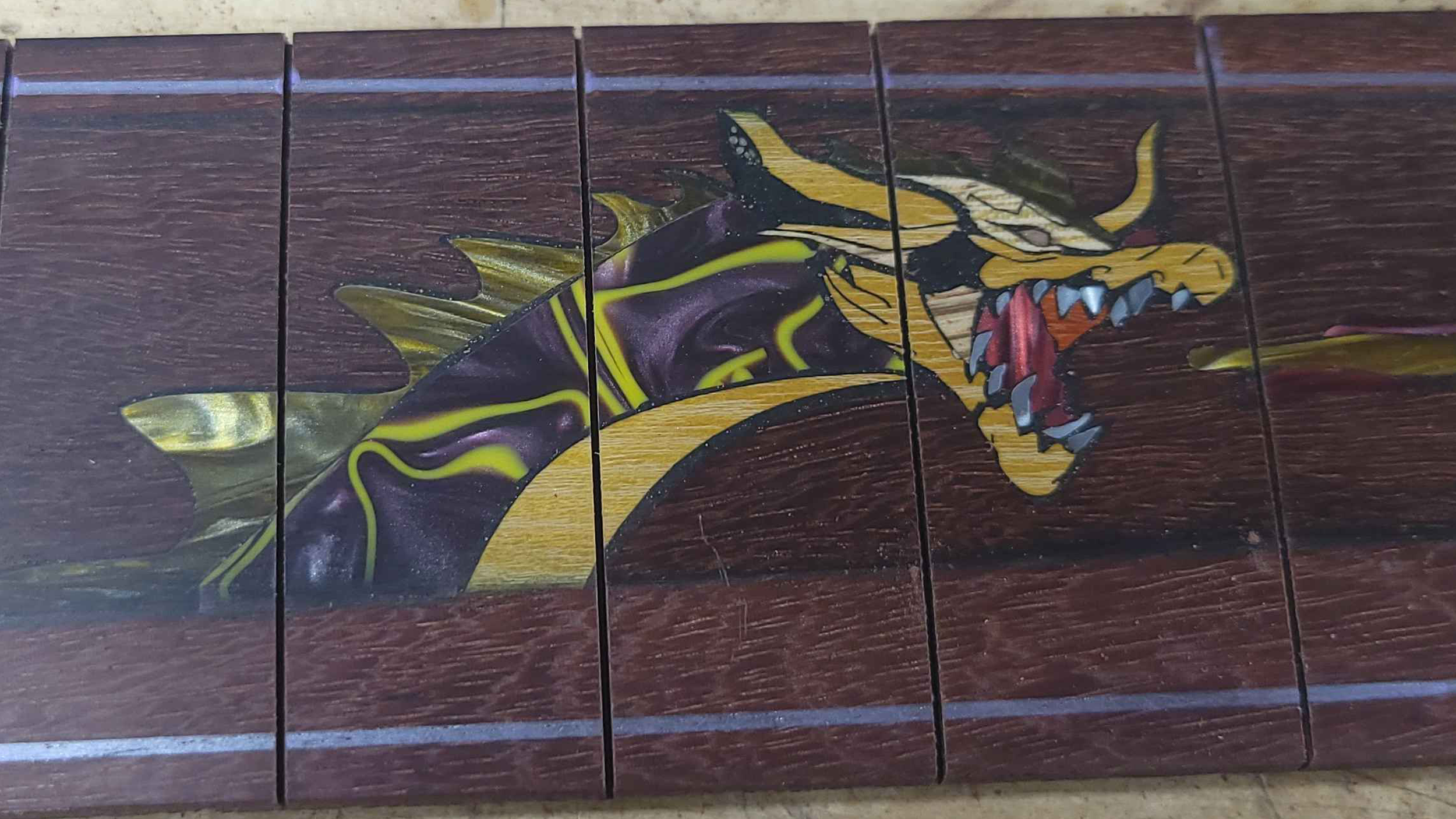 Paul’s fretboard before frets, with a dragon inlay made of Kirinite and osage orange wood