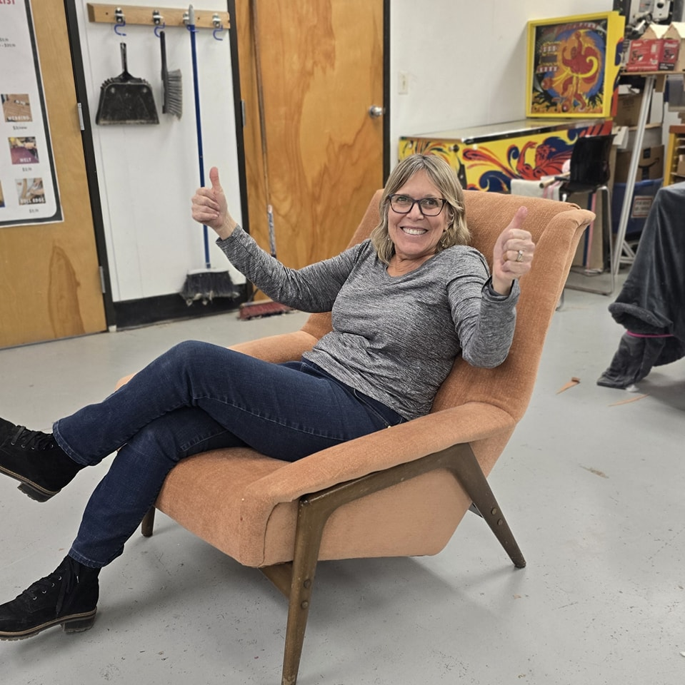 She talked with staff and found out she could rent out the conference room. Ever since, she’s been running her upholstery classes at Maker Works and has taught hundreds of people who’d never before picked up a staple gun. Some of those people went on to make their own upholstery businesses!
